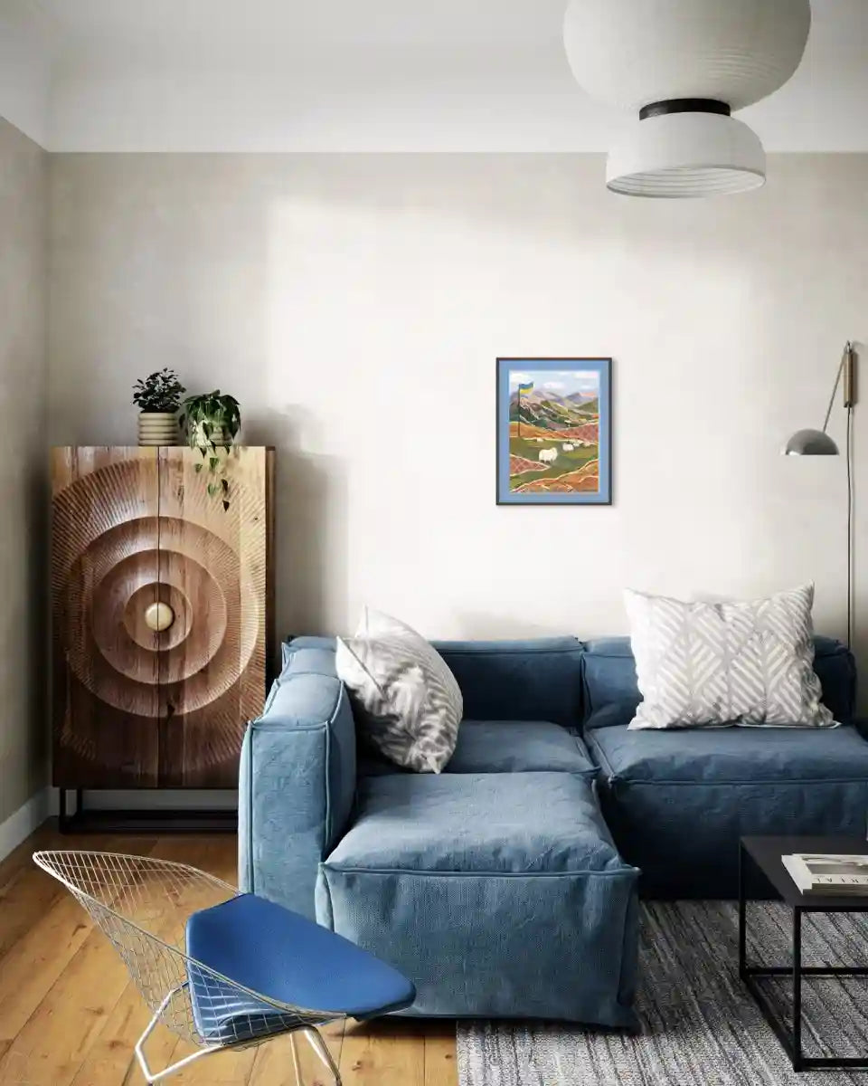 Ciepła ilustracja górskiego pejzażu niosąca poczucie wolności i przestrzeni. Ludowe ornamenty, miękka kolorystyka i spokojny rytm natury wprowadzają do wnętrza przytulną, inspirującą atmosferę.