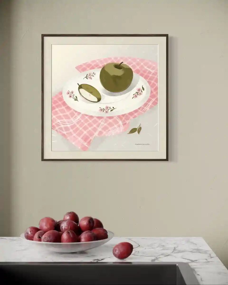 Натюрморт із яблуком передає відчуття спокою, домашнього тепла та уваги до дрібних деталей. Мʼяка кольорова палітра й лаконічна композиція роблять роботу універсальною — вона легко вписується у сучасні, мінімалістичні та скандинавські інтерʼєри.