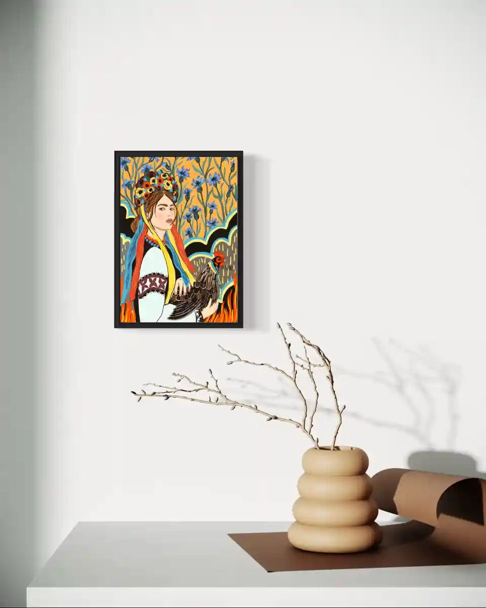 Ця ілюстрація зображує відважну українку, що стоїть із куркою в руках, яка стає символом її рішучості та зв'язку з рідною землею. Її погляд сповнений сили, готовності захищати свою родину та традиції. Курка в її руках – це не просто птах, це символ родинного тепла, праці та простих радощів життя, які є важливими навіть у часи випробувань.