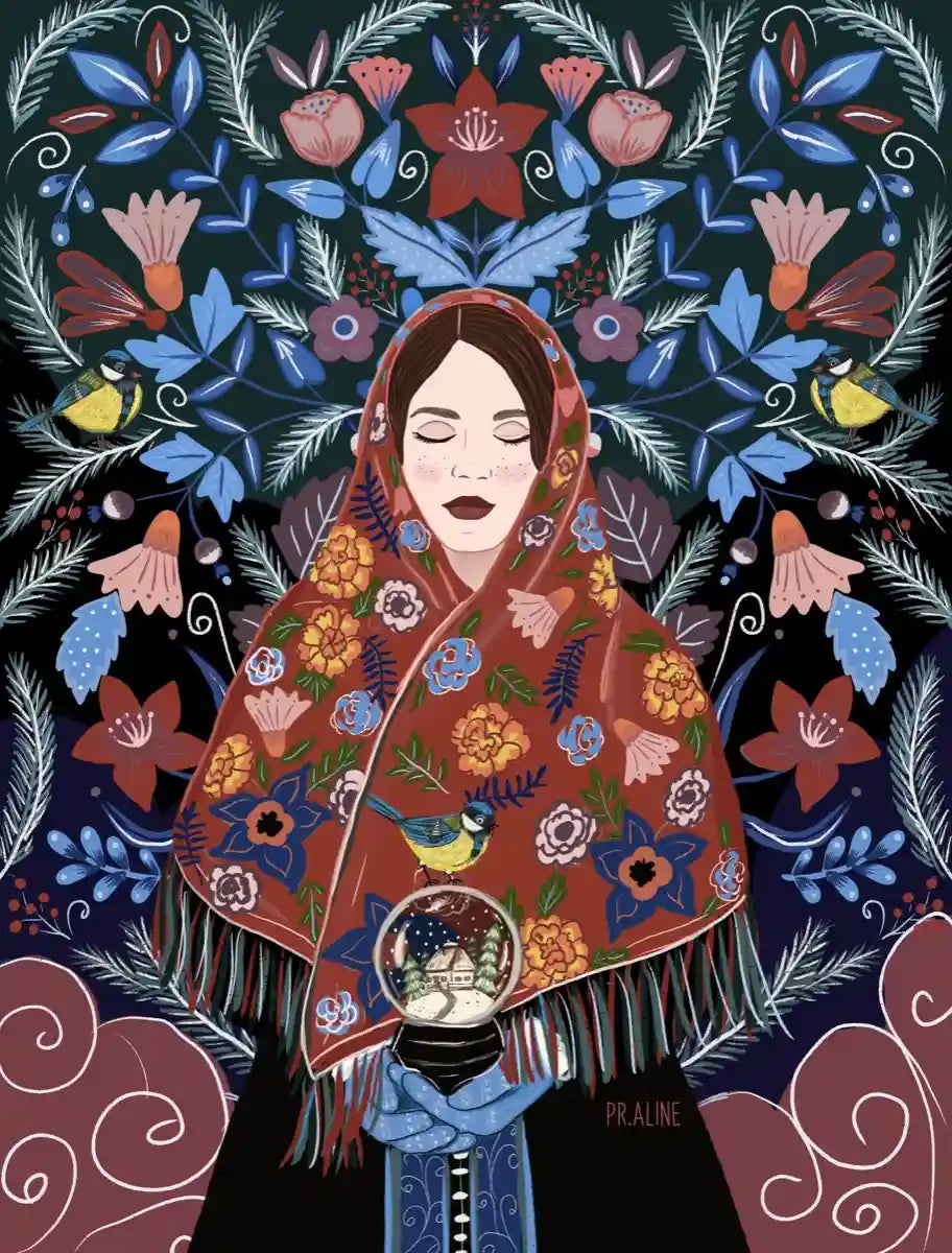 Ця ілюстрація передає особливу зимову магію та душевне тепло. На ній зображена молода дівчина в традиційній українській хустці, укутаній ніжним зимовим візерунком. Хустка лагідно огортає її обличчя, ніби зберігаючи в собі тепло домашнього вогнища, а на її щоках грає легкий рум’янець від морозу.