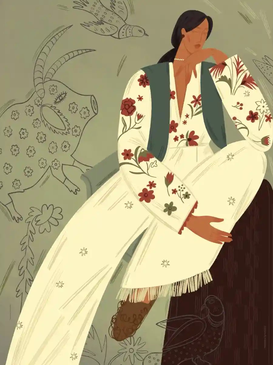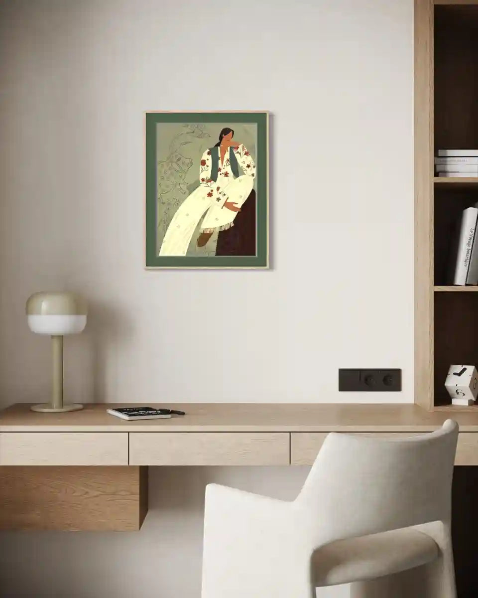 Жіночий образ у традиційному вбранні поєднується з декоративними елементами й орнаментальними мотивами, створюючи діалог між реальністю та фантазією. Композиція передає відчуття тиші, мрійливості та внутрішньої свободи, роблячи цю роботу особливою для особистих і затишних інтерʼєрів.