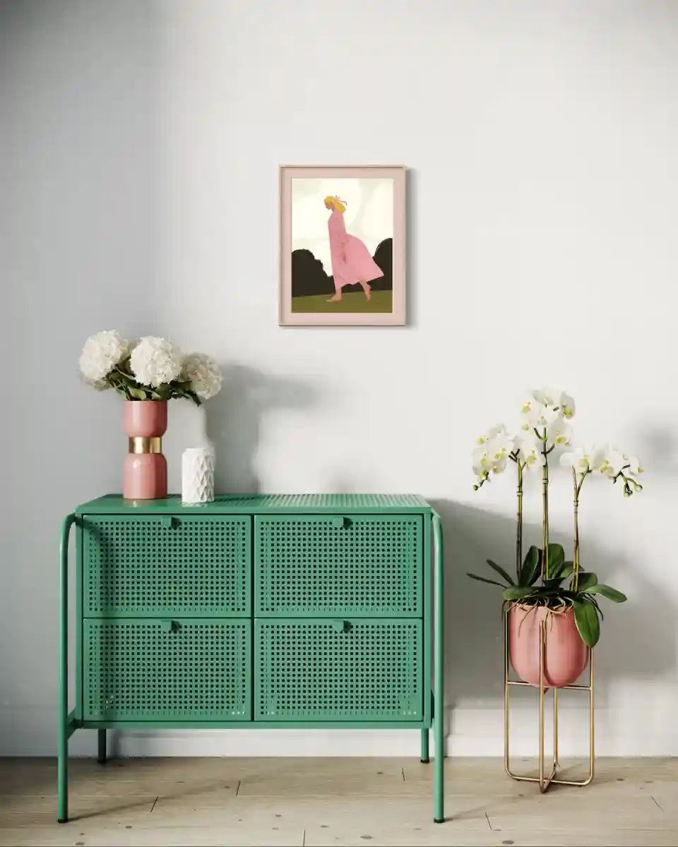 Образ жінки, що йде вперед, передає відчуття легкості, свободи та природного ритму. Мʼяка кольорова палітра й прості форми створюють атмосферу гармонії та затишку, роблячи роботу ідеальною для сучасних інтерʼєрів.